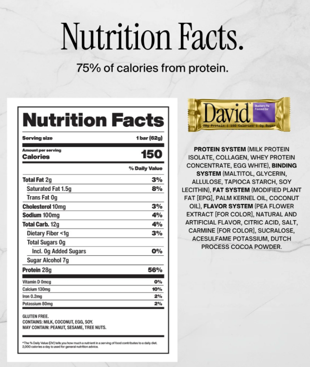 The most effective portable protein on this planet. David crafts high-protein, low-calorie, blood-sugar-friendly foods - and they're craveable! 75% of the calories from David come from protein. The industry has never seen a protein bar with that kind of protein-to-calories ratio.